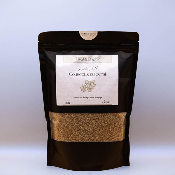 Découvrez notre couscous au persil, un délice authentique de la région de Chefchaouen, certifié par l'ONSSA. Infusé de persil frais, ce couscous traditionnel offre une saveur aromatique et une texture agréable, enrichie de fibres et de nutriments. Idéal pour ajouter une touche herbacée à vos plats, il est parfait pour créer des repas à la fois savoureux et sains. Commandez dès aujourd’hui pour savourer ce couscous parfumé et nourrissant !