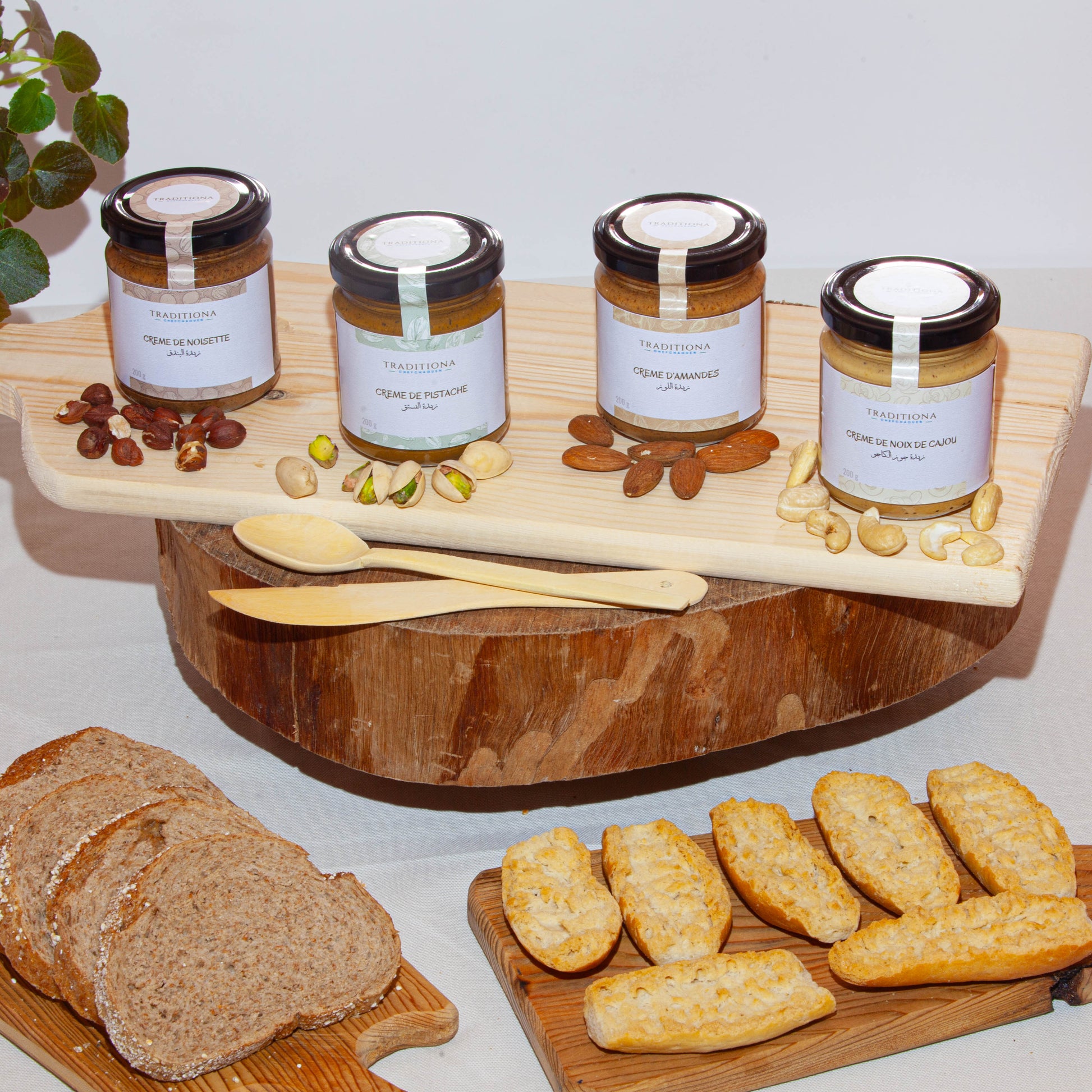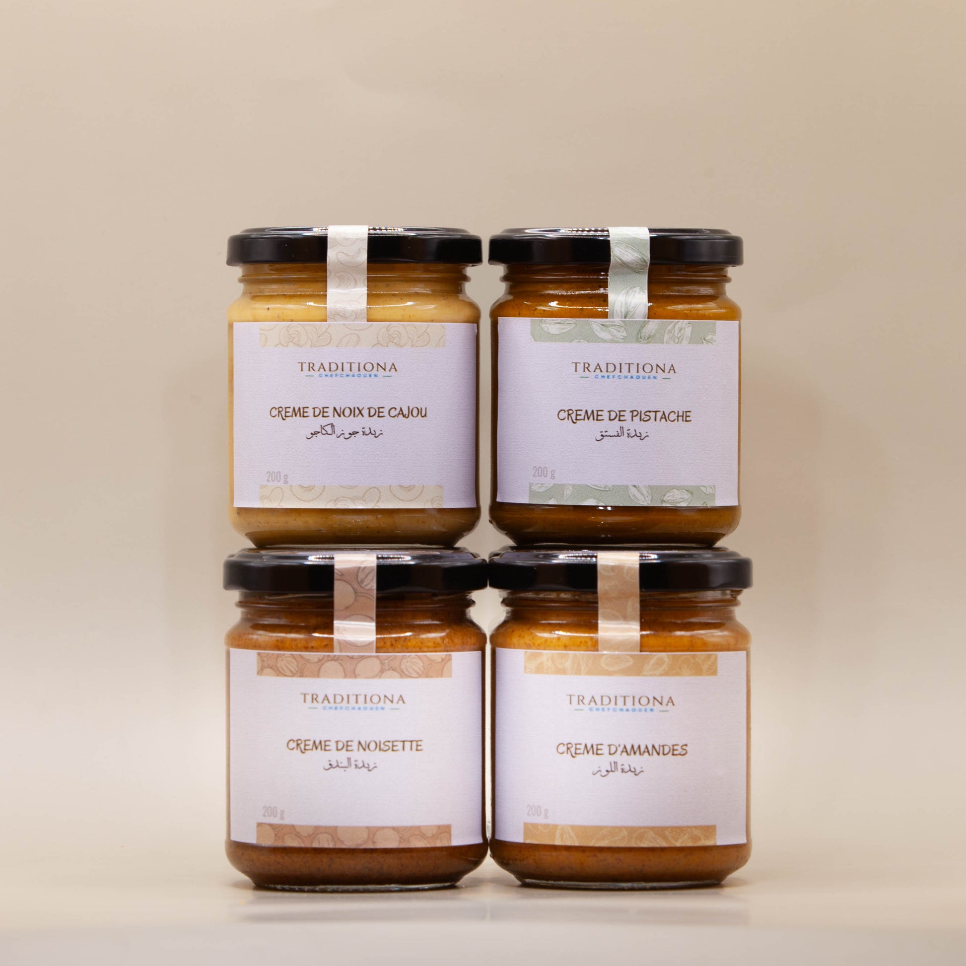 Découvrez notre pack Authentique préparé avec soin à Chefchaouen, comprenant 4 crèmes 100% naturelles : crème d’amandes, crème de noix de cajou, crème de noisette, et crème de pistache. Ces crèmes sont sans sel, sans sucre ajouté, et sans huile, offrant une pureté inégalée sans aucun additif. Fabriquées artisanalement dans la région de Chefchaouen, ces crèmes reflètent le savoir-faire local et garantissent une qualité exceptionnelle. Profitez d'une expérience gourmande, saine et authentique, tout en soutenant les producteurs de cette région.