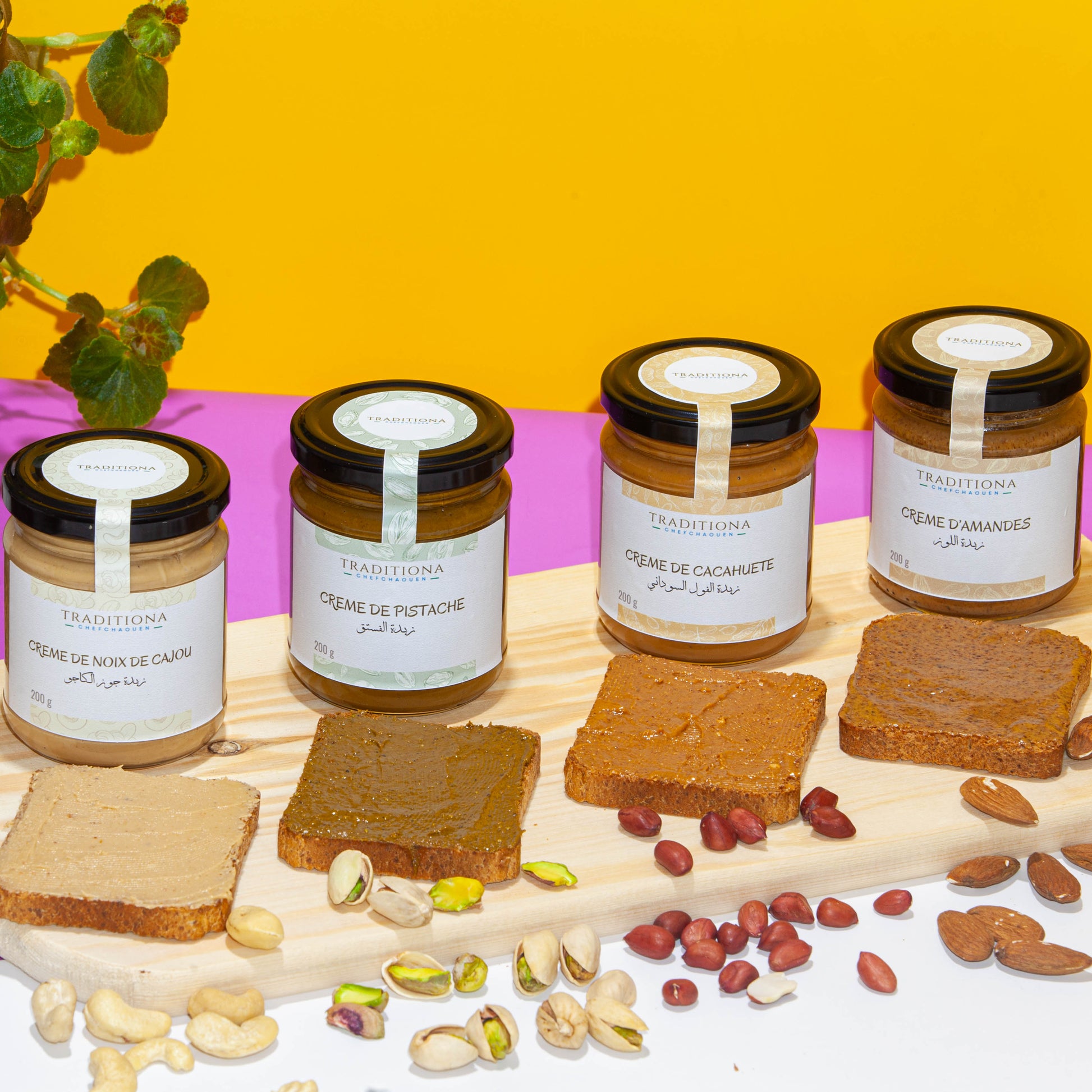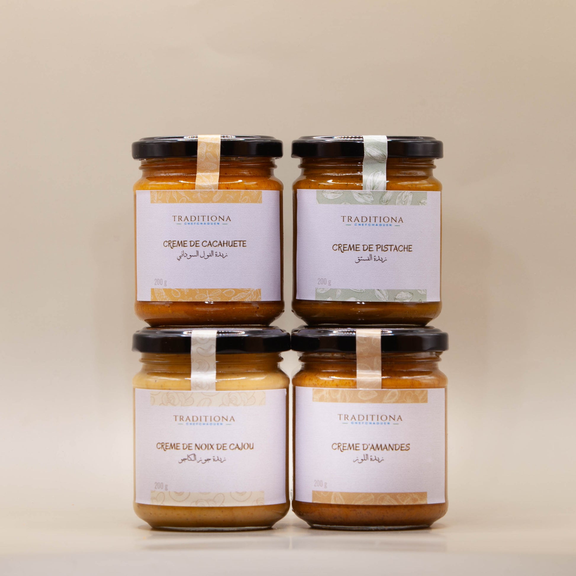Découvrez notre pack de Saveur préparé à Chefchaouen, composé de quatre crèmes savoureuses : crème de pistache, crème d'amande, crème de noix de cajou, et crème de cacahuète.