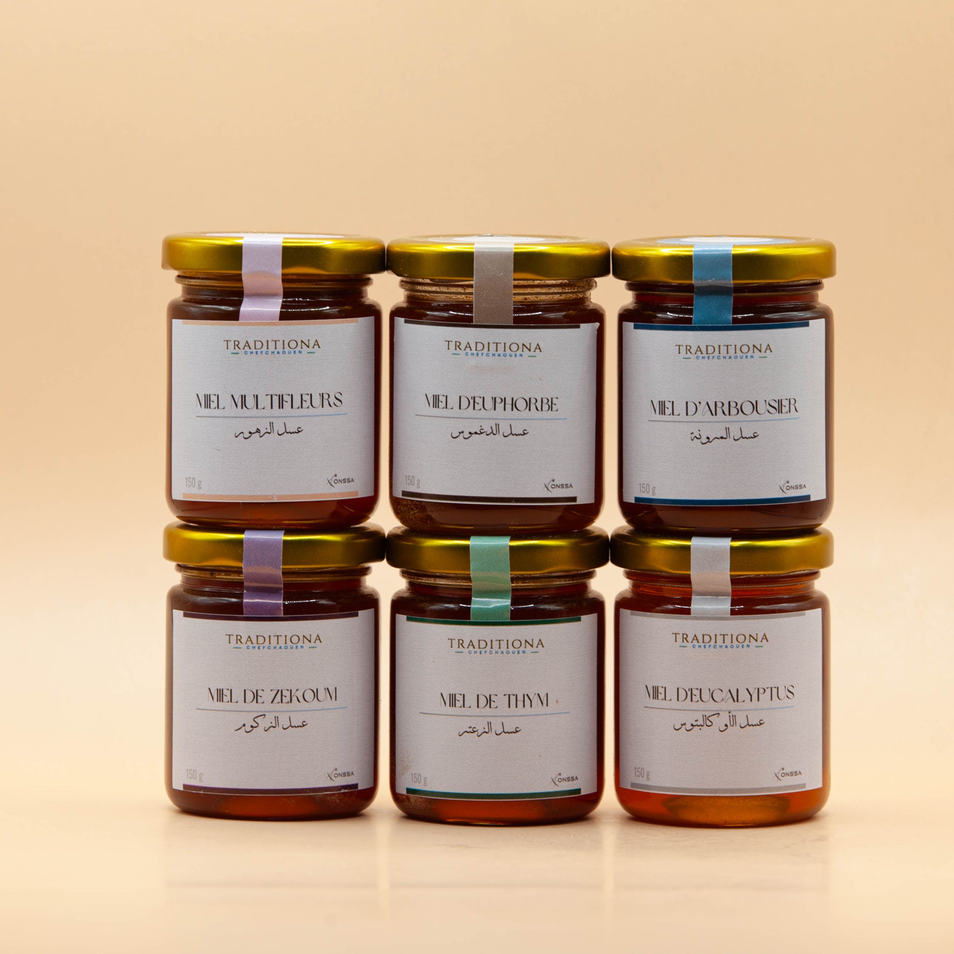 Découvrez notre pack Découverte de 6 miels, un véritable voyage au cœur des saveurs authentiques de Chefchaouen. Ce coffret comprend les miels de Thym, Zekoum, Eucalyptus, Euphorbe, Multifleurs, et Arbousier, tous 100% naturels et bio, sans aucun additif. Chaque pot est un concentré de la richesse des fleurs et des plantes de la région, produit avec soin par les artisans locaux. Plongez dans la pureté de ces miels uniques et savourez les bienfaits de la nature marocaine, tout en soutenant les petits producteurs.