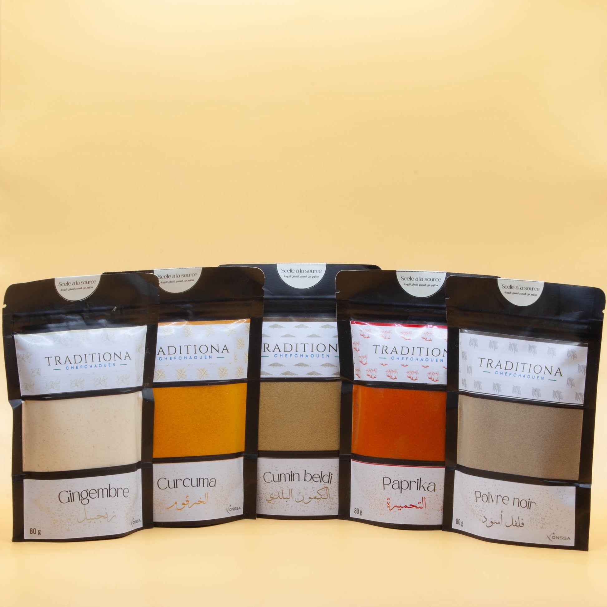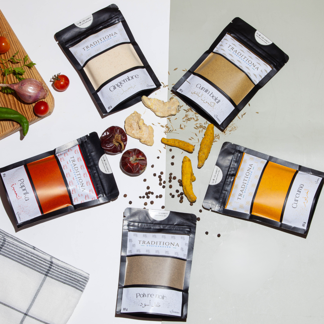 Découvrez notre pack d'épices "essentiels", composé de gingembre, curcuma, poivre noir, cumin, et paprika, préparés avec soin dans la région de Chefchaouen. Chaque ingrédient incarne le savoir-faire artisanal de Chefchaouen, apportant des saveurs uniques et puissantes à vos plats. Ce pack est idéal pour enrichir vos recettes avec des épices de qualité supérieure, tout en soutenant les communautés locales. Parfait pour ceux qui recherchent des produits authentiques et naturels.